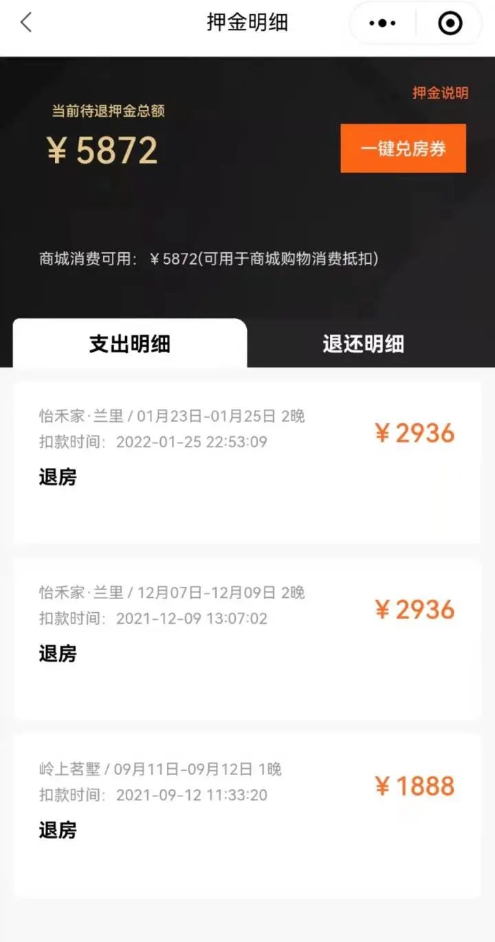 “2021年12月,我订了杭州西湖区的怡禾家·兰里民宿,但后面计划有变,就提前取消了预订,然后又在2022年1月预订。但奇怪的是,不仅第一次取消房间的押金没退,第二次入住退房之后的押金也没退,共计5872元。然后平台上显示入住3次,其实我只住进2次。 ”秦女士说。