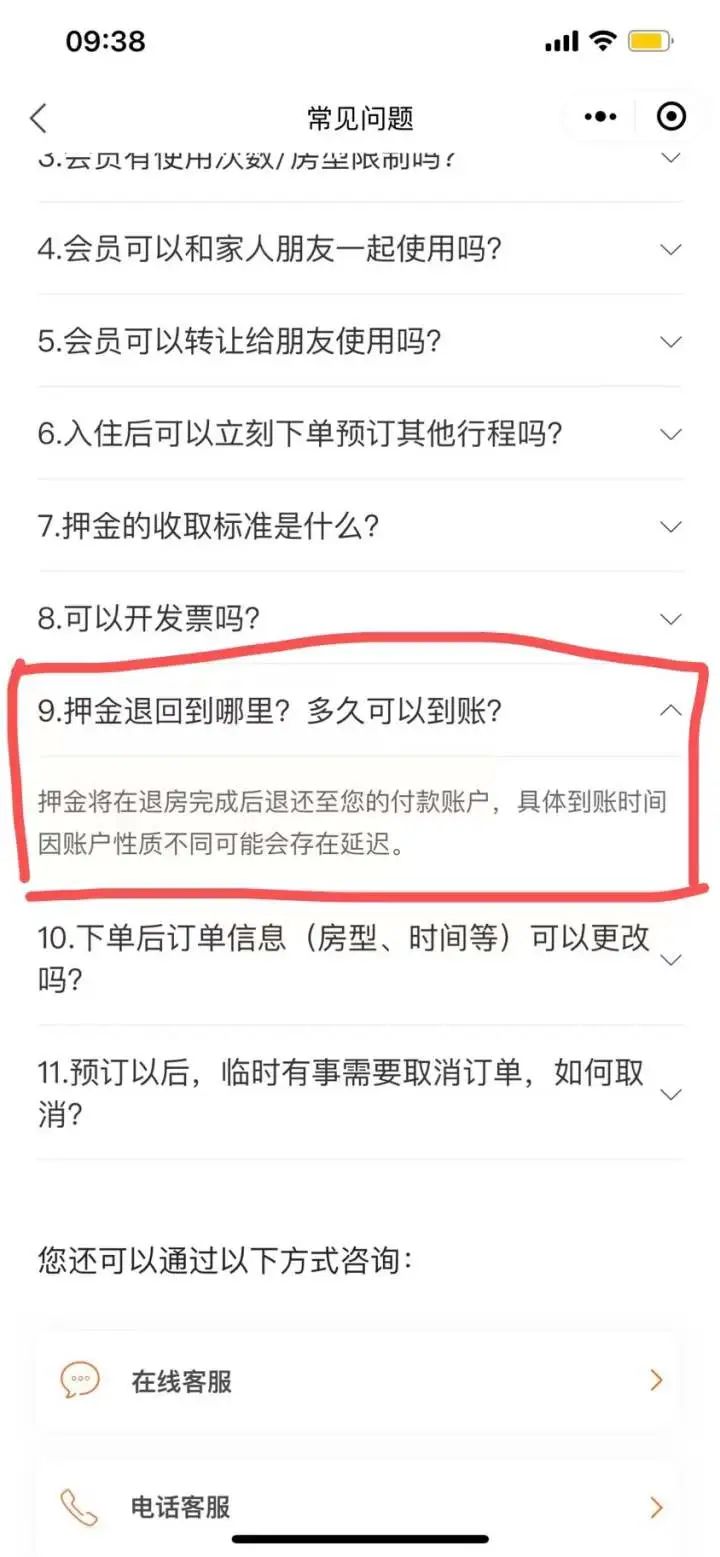在平台上,记者也找到了客服入口,在常见问题中有一条关于押金的回答,其中写道:押金将在退房完成后退还至您的付款账户,具体到账时间因账户性质不同可能会存在延迟。