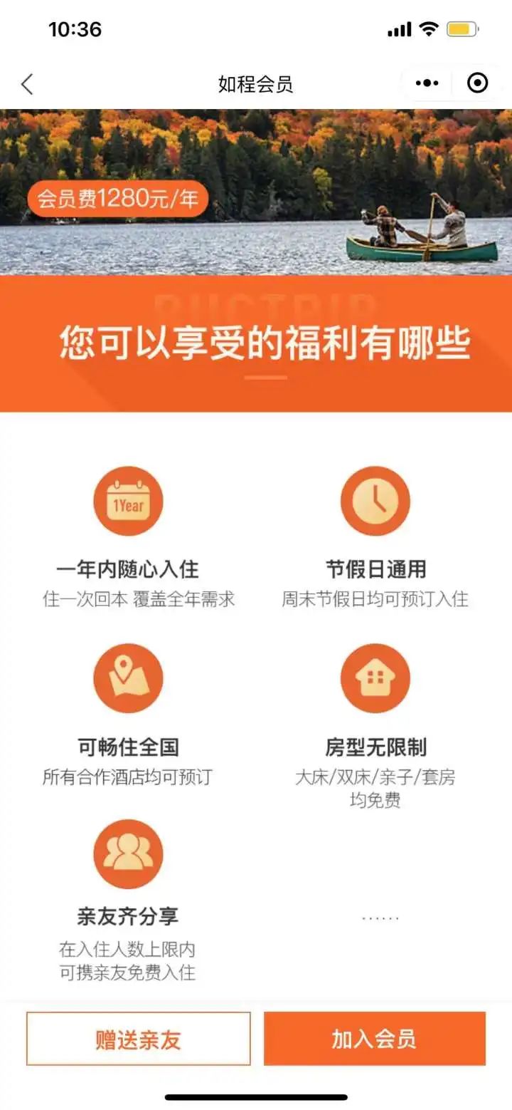 在加入会员界面,有“一年内随心入住”、“节假日通用”、“可畅住全国”、“房型无限制”、“亲友齐分享”等等会员优享服务介绍。