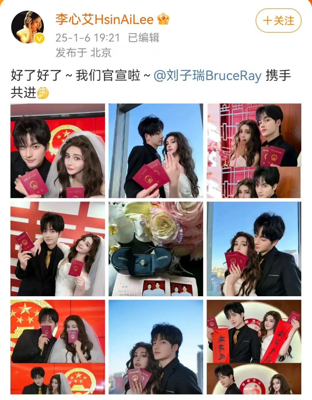 1月6日晚,李心艾在个人社交平台晒出多张结婚照,并配文:好了好了,我们官宣啦!刘子瑞,携手共进。