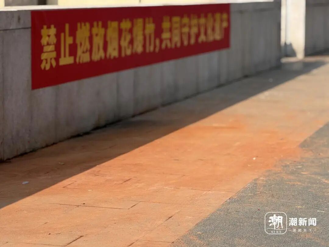 沿着台阶而上,海塘上已拉起一条长横幅“禁止燃放烟花爆竹,共同守护文化遗产”。虽然是白天,但记者仍能闻到一股烟花硫黄的气味,草丛中能看到些许烟花的包装。特别是在横幅下,部分地面呈现焦黄的颜色,有些位置已被熏黑。
