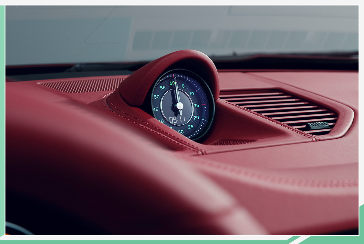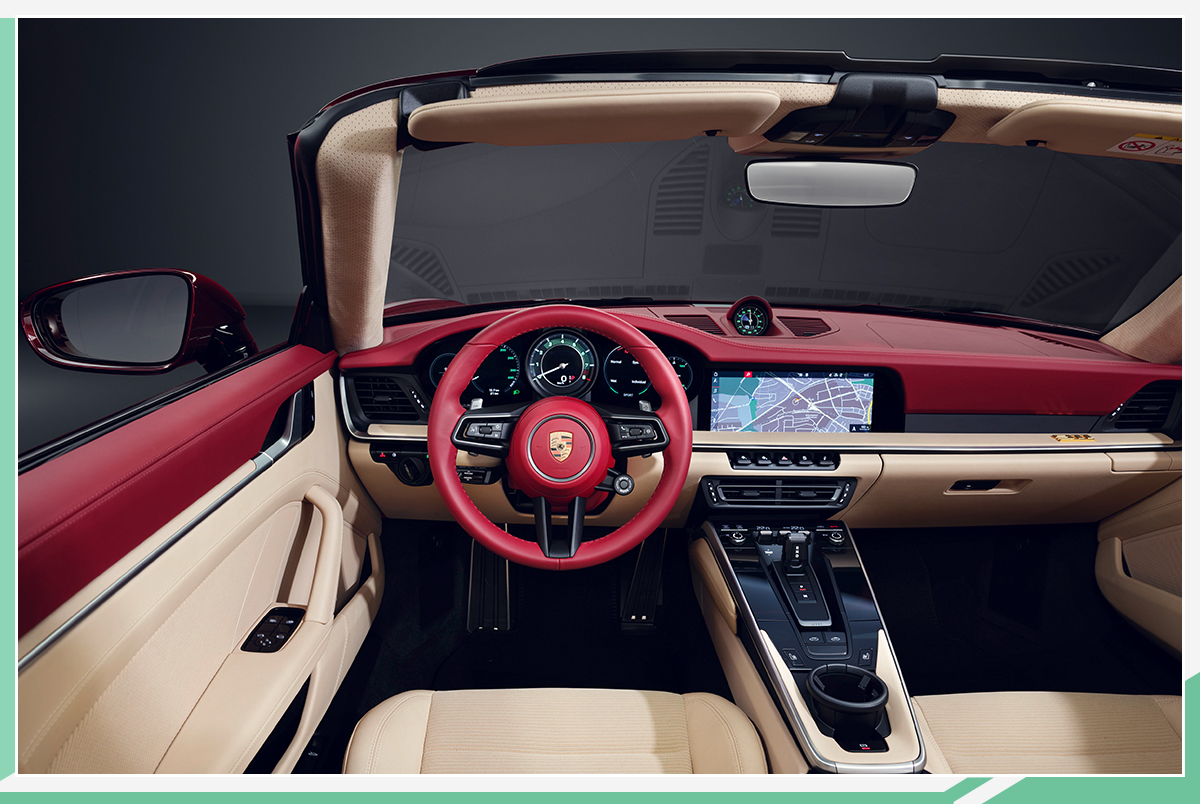 新车提供两款独特的双色调真皮内饰:波尔多红色真皮搭配阿塔卡米色致新真皮,以及黑色真皮搭配阿塔卡米色致新真皮。座椅和车门饰件选用的灯芯绒曾是保时捷356的经典配置,仪表板饰板上的金属徽标上带有每台车的限量版编号。