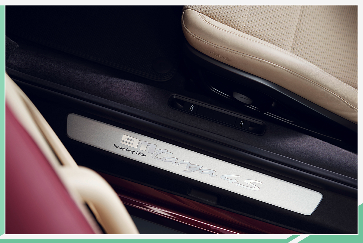 在车尾和Targa防滚架上可以看到金色的标志,重现了另一个具有历史意义的设计。从1950年代中期开始,保时捷车尾的标志开始采用金色。随着1965年保时捷912以及1968年保时捷911 T的推出,金色标志逐渐被银色和黑色电镀字母取代。如今,金色标志宣告回归,将在未来所有Heritage Design车型上采用。