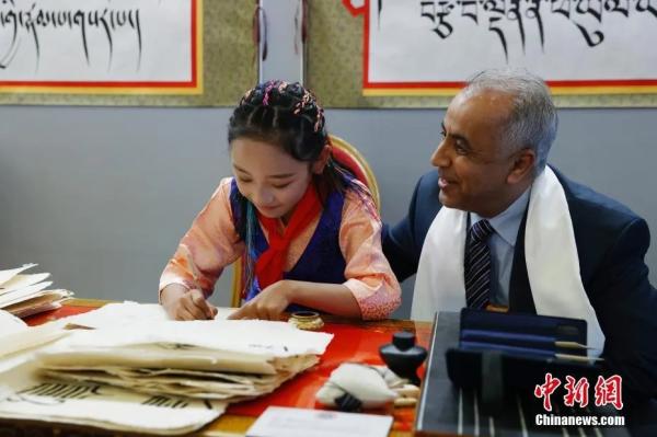 图为阿曼驻华大使纳赛尔(右一)与表演书法的小朋友交流。 中新社记者 韩海丹 摄