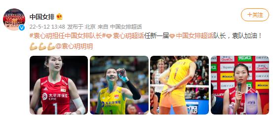 中国女排官方微博5月12日发文称,袁心玥任新一届中国女排队长,袁队加油!