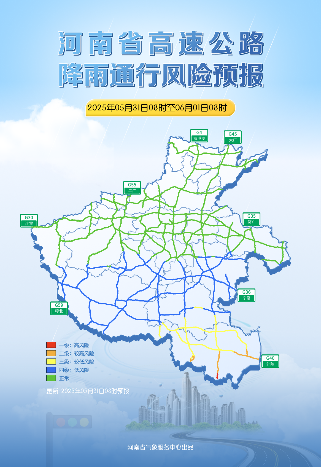 河南省高速公路降雨通行风险预报:今明两天,南部地区高速公路有降雨通行风险,今天信阳部分路段有较高风险,需警惕道路湿滑、低能见度对出行的影响,减速慢行,谨慎驾驶。