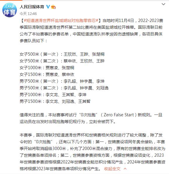 当地时间11月4日,2022-2023赛季国际滑联短道速滑世界杯第二站比赛将在美国盐湖城拉开帷幕。国际滑联日前公布了本站赛事的参赛名单,中国短道速滑队林孝埈因伤遗憾缺席,各项目具体参赛队员如下: