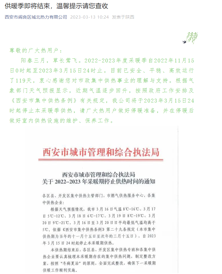 西安市阎良区城北热力有限公司、高陵热力发布通知称,根据气象部门天气预报显示,近期气温逐步回升,按照政府工作安排及《西安市集中供热条例》有关规定,我公司将于2023年3月15日24时起停止本采暖季供热,请广大供热用户做好停暖准备,并在停暖后做好室内供热设施的维护、保养工作 。