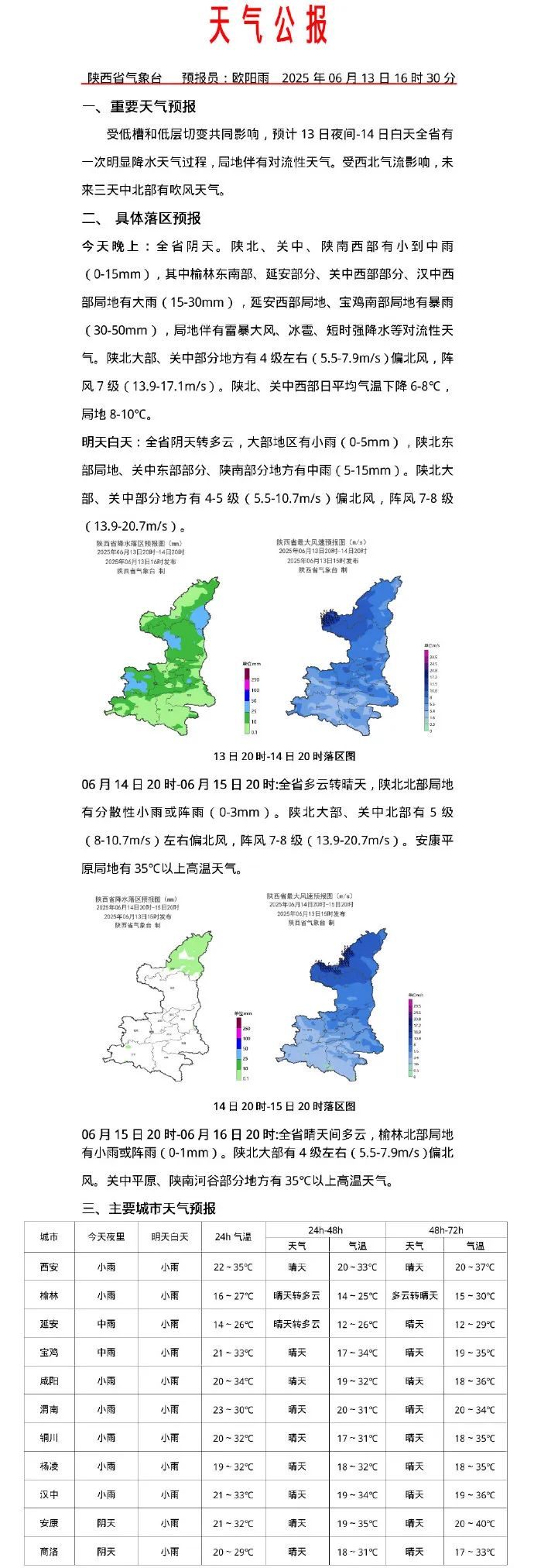 受高空槽和低层切变共同影响,预计6月13日15时至14日15时,陕北、关中北部及西部、汉中西部有雷暴天气,其中榆林南部、延安大部、铜川西部、咸阳北部、宝鸡大部、汉中西部局地有雷暴大风,阵风可达8级(17.2m/s)以上,榆林东部局地(佳县)、延安北部及东部局地(延长、志丹、富县)、咸阳北部局地(旬邑)、宝鸡北部局地(陇县)有冰雹,榆林东部局地(佳县)、延安东部及西部局地(延川、延长)、咸阳北部局地(彬县)、宝鸡北部(千阳、麟游)有短时强降水(小时雨强10-20mm/h,个别点可达30mm/h以上)。
