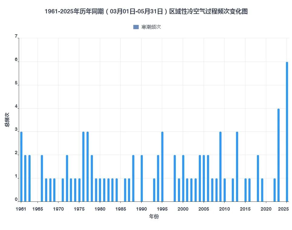 图10 陕西省1961-2025年春季区域性寒潮过程频次变化
