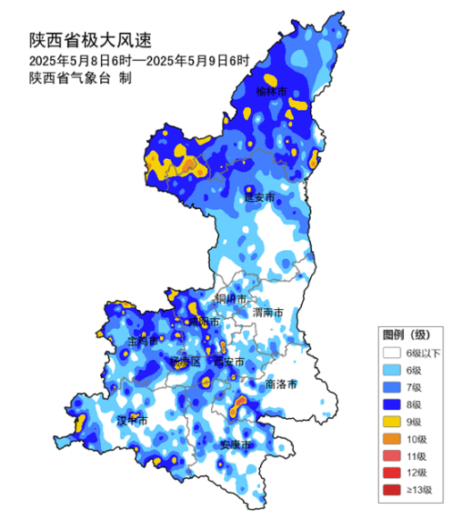 图4 陕西省2025年5月8日6时-9日6时极大风速分布