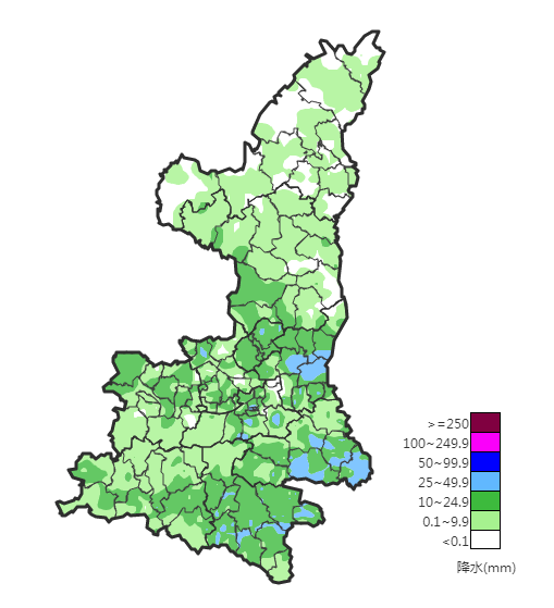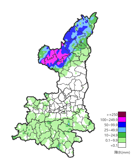 7月25-26日陕北出现强降水,榆林和延安北部共13站累计雨量超过200毫米。此次降水极端性强、降水时段集中,9个区域站日降水量突破建站以来极值。25日为降水最强时段,定边新安边日降水量达264.5毫米,吴起铁边城达230.9毫米,日雨量接近或超年平均降水量的一半。降水造成吴起县部分街道被淹、商铺房屋进水,主城区、铁边城镇、吴仓堡镇等地区部分电力设施受损。降雨还导致北洛河流域接连拉响警报,干支流出现超警戒洪峰流量。