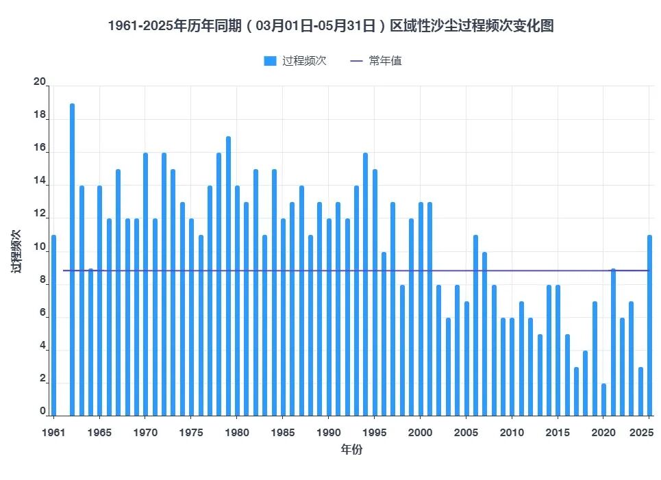 图6 陕西省1961-2025年春季区域性沙尘过程频次变化