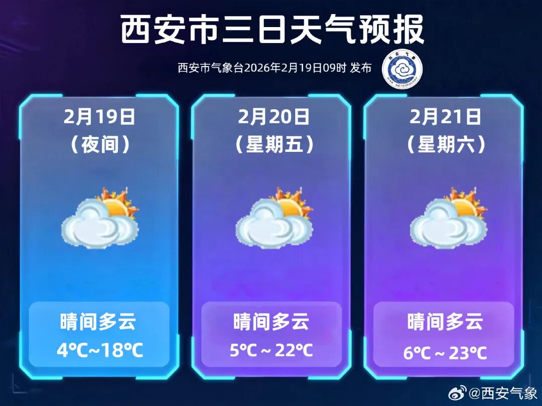2月19日,据西安气象消息,未来三天西安市维持晴到多云天气,最高气温持续升高,预计21日最高气温将至22℃-23℃。
