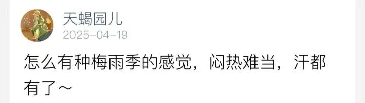 昨天的雨水“爽约”了,且空气湿度较大,不少朋友都在说闷热感十足。有网友说,闷得像是梅雨季。