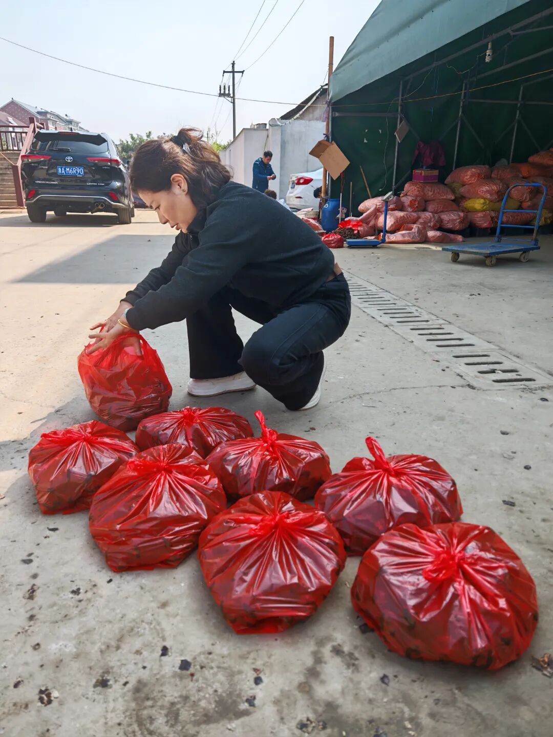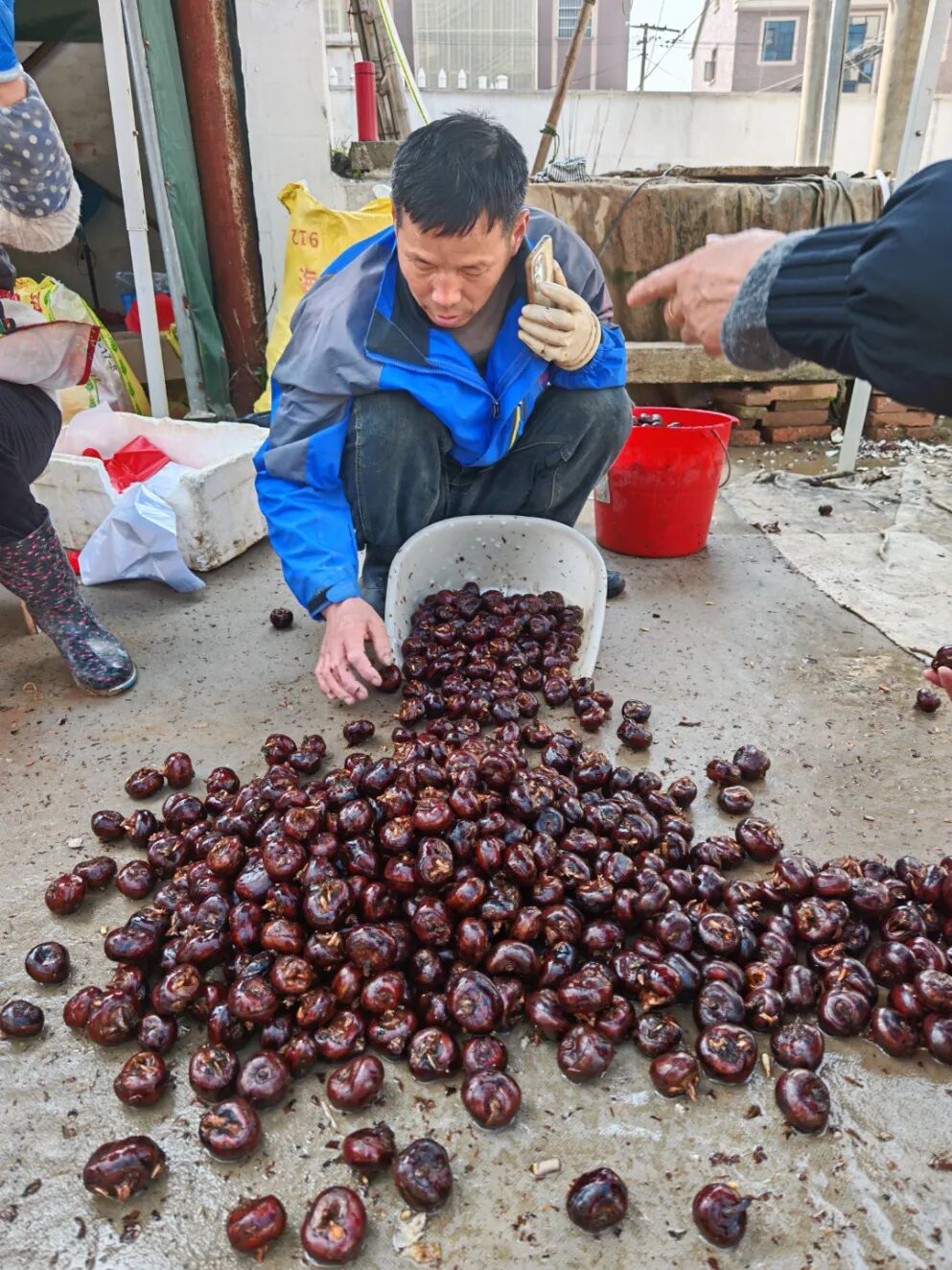 近日因荸荠而爆火的农家小院,位于崇贤街道北“四好农村路”独鸭线边上,路口到门口50米左右,停了五六辆私家车,走进院子,靠门就地摆着成堆的荸荠,老板姚国强忙着用红色塑料袋分装荸荠,老板娘在一旁称重,10斤一袋,称好一袋就被递给等着的顾客。