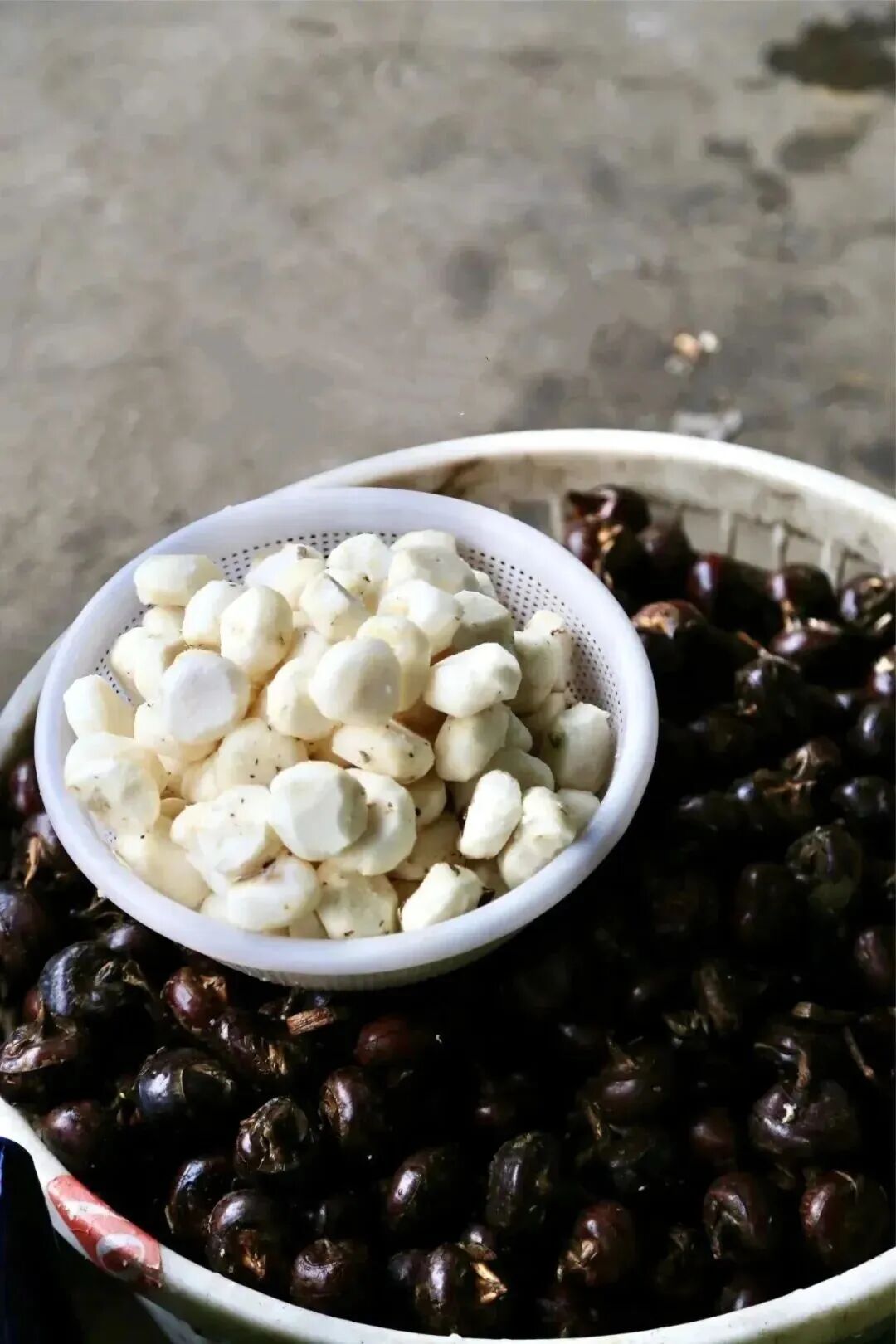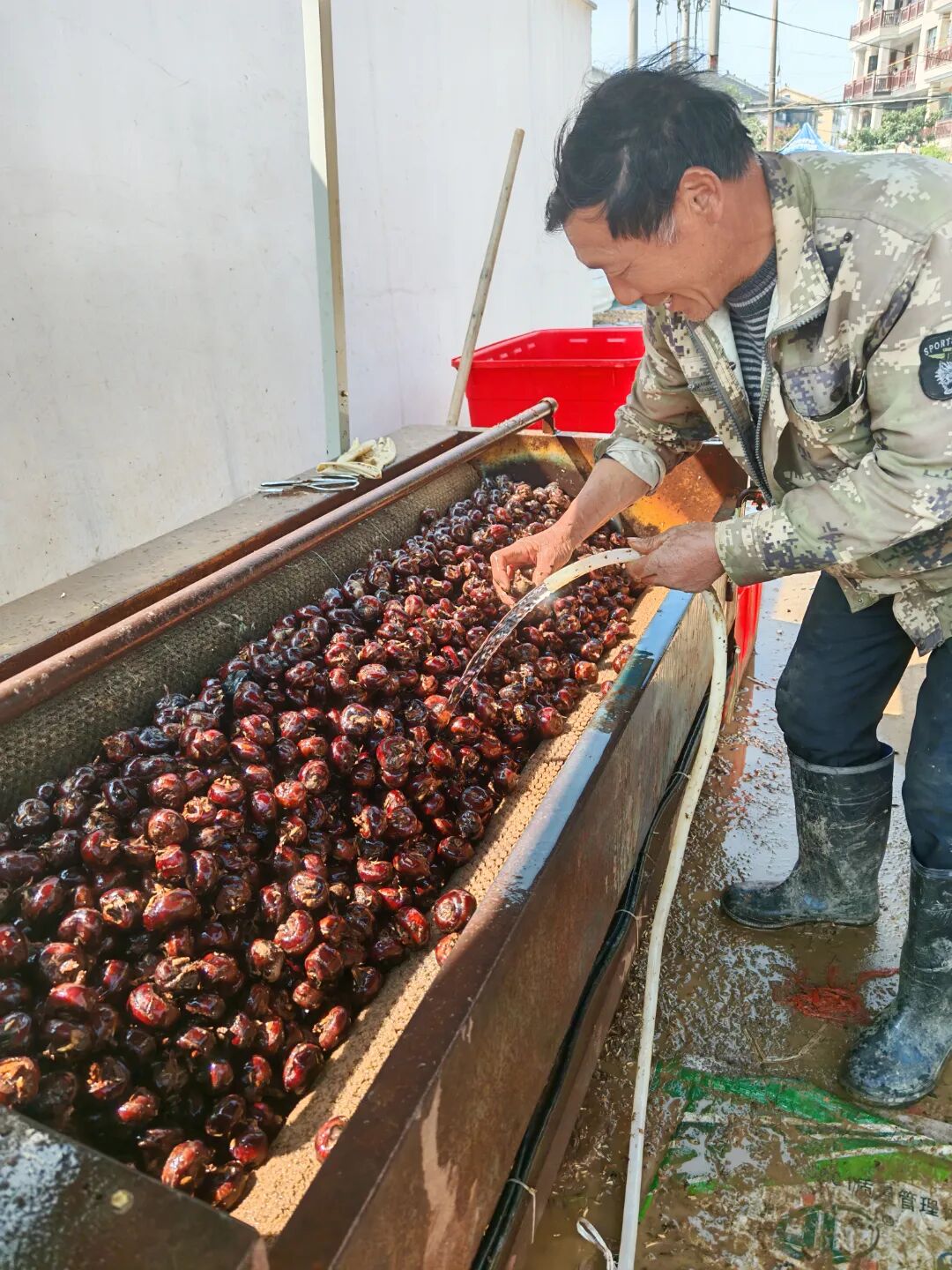 院子深处摆着一台长长的电动清洗机,老板的家人正不停地浇水清洗着荸荠,清洗完成就运到门前分装售卖,有时候清洗还跟不上售卖的速度。