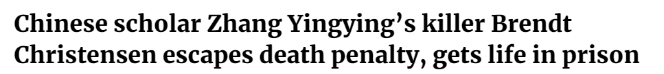 “据美媒报道,谋杀章莹颖的被告布伦特⋅克里斯滕森被判终身监禁。”