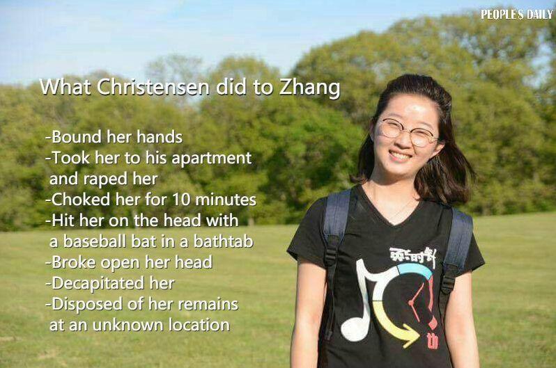 760多个日夜后,章莹颖家人等来了美国法院这样的判决结果:被告布伦特⋅克里斯滕森被判处终身监禁,不得减刑假释。详情请点击:章莹颖案宣判后,杀人恶魔笑了