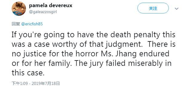 “只有被告被判处死刑,这个案件才算得到公正的判决。章莹颖和她家人经历了那么多可怕的事情,但他们的冤屈得不到伸张。这起案件的陪审团真是输得很可悲。”