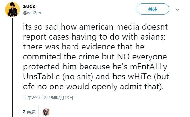 “发现不少美国媒体并没有报道这起涉及亚洲人的案件,这让我很失望。犯人谋杀章莹颖铁证如山,但是他还是受到一些人保护,因为他精神不稳定(什么狗屁借口),而且他是个白人(当然没人会公开承认这点)。”