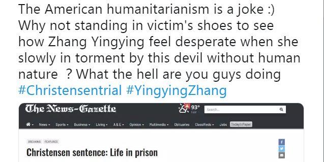 考虑到罪犯布伦特⋅克里斯滕对章莹颖所做过的事情(他承认杀害章莹颖,作案细节曝光),以及他给章莹颖家人带来的打击和伤痛, 终身监禁这一判决让章莹颖家人以及很多网友愤愤不平。