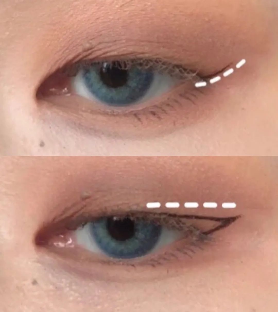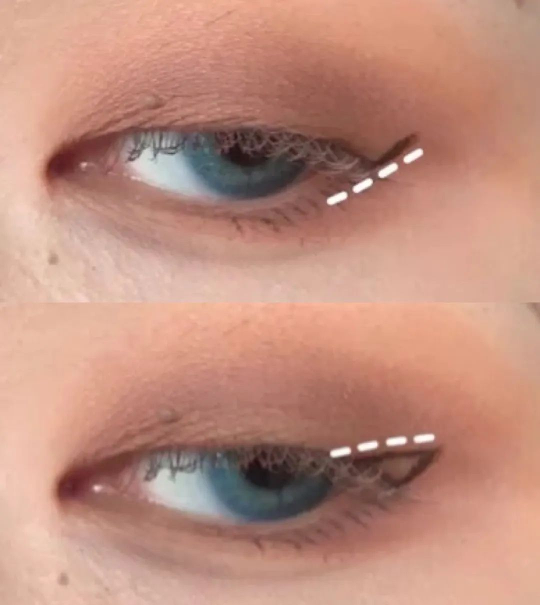 4.顺着下眼睑末端拉出上扬线条(不要太长),在上扬线条的末端往回拉出一条平行线,停在眼珠后边缘位置的睫毛根部上,完成填色即可。