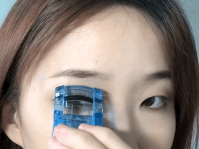 单眼皮姐妹夹睫毛时尽量分3段夹:先夹住中间睫毛的根部,向上抬一下,然后一点点拖出来夹,眼尾和眼头同理。过程中控制力度,避免过于用力夹出折痕。