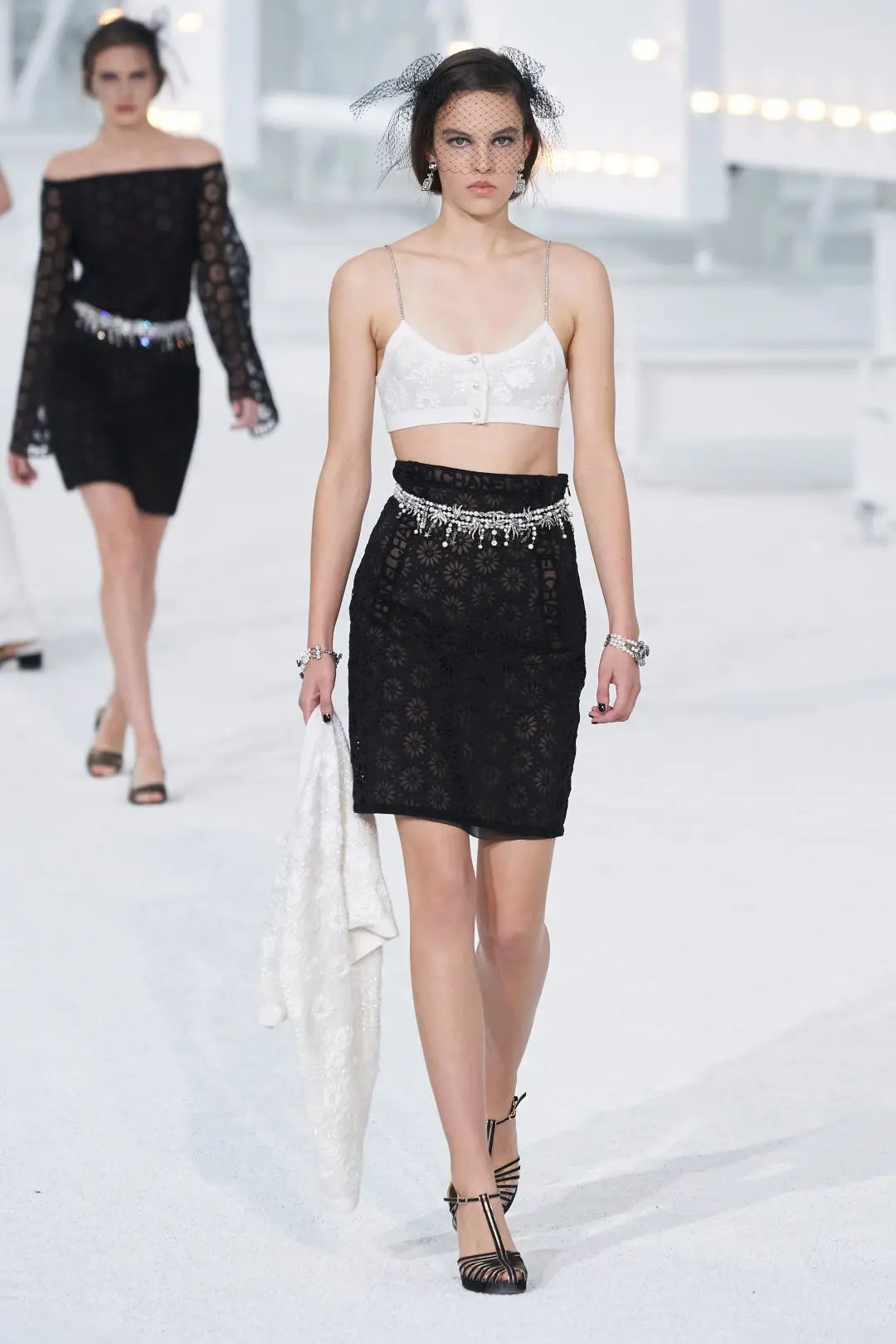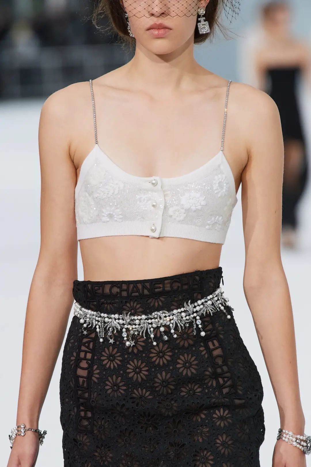 如果喜欢更正式的时装款吊带,一定不要错过Chanel这款针织背心,浮雕刺绣的暗纹处处体现着Chanel精美的工艺,水钻吊带更是给整体造型增加了亮点。