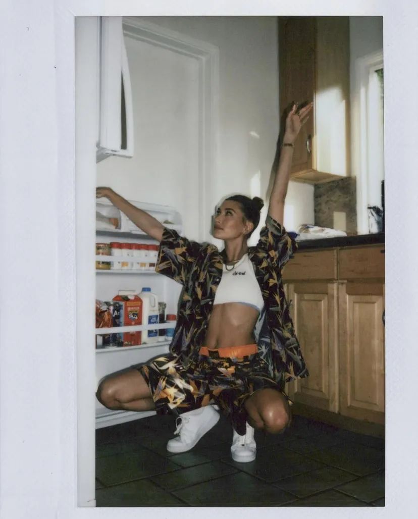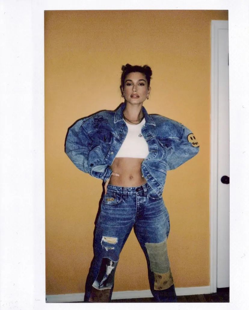 Hailey也很爱穿这种圆领的短款背心,搭配牛仔外套或迷彩服