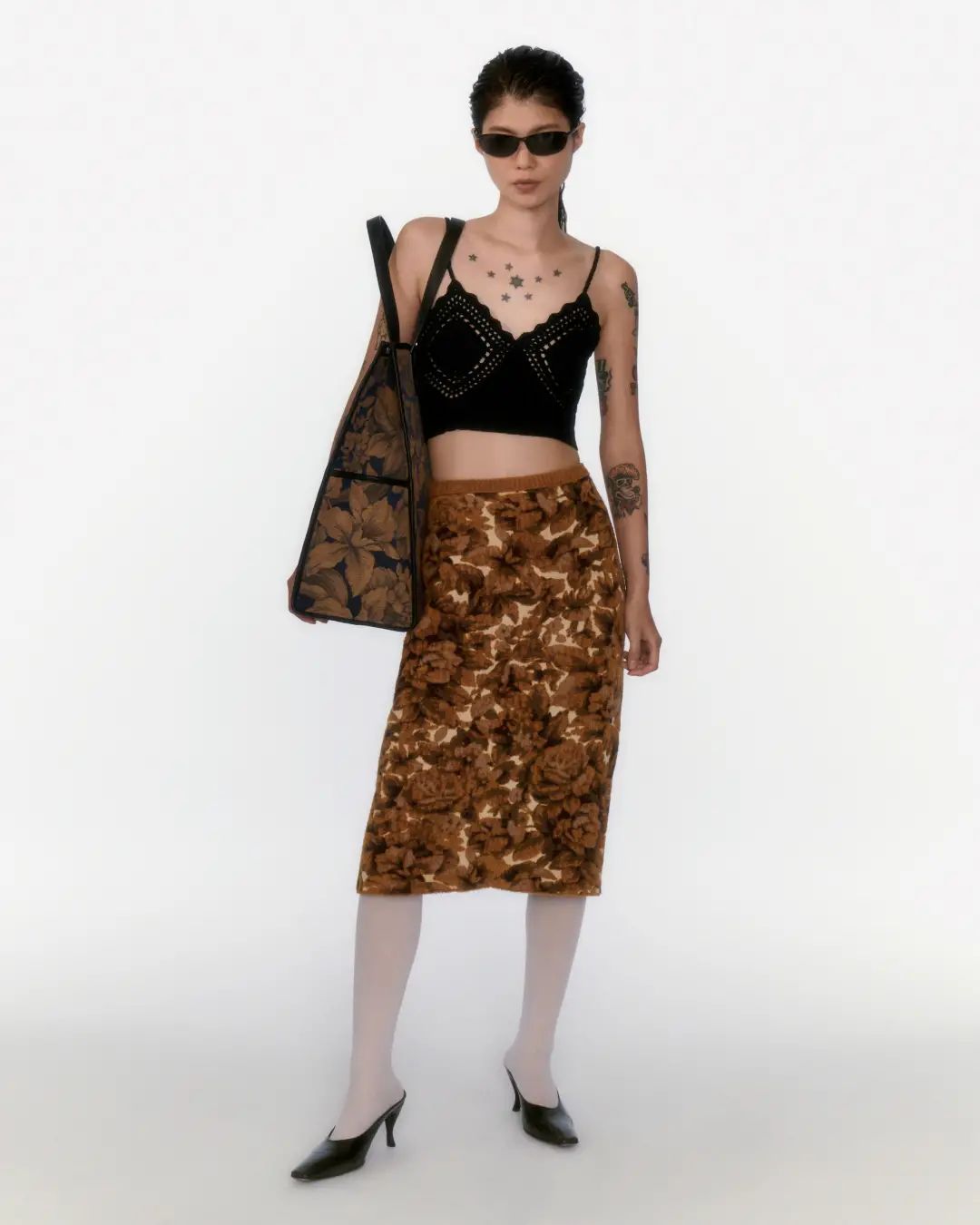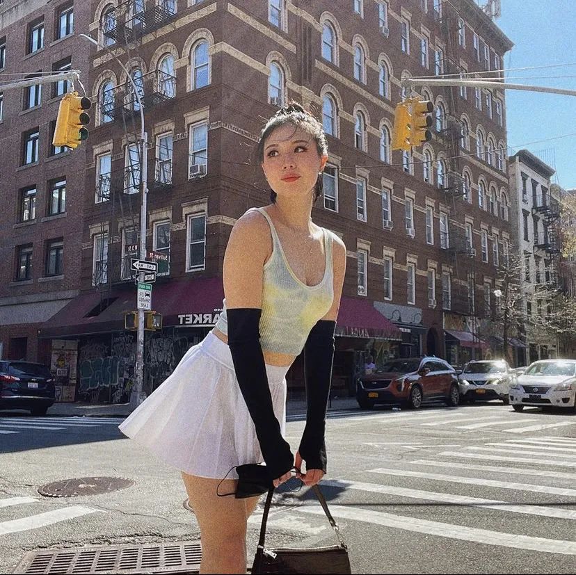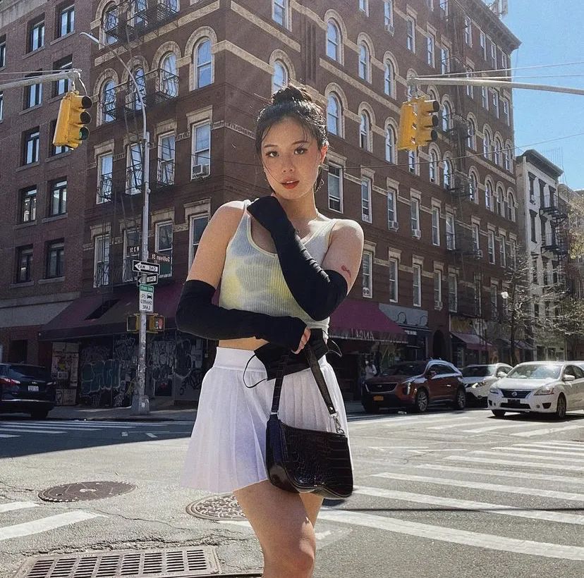 针织背心配网球短裙,黑色袖套增添一份时髦感,简直是街头的夏日甜心。