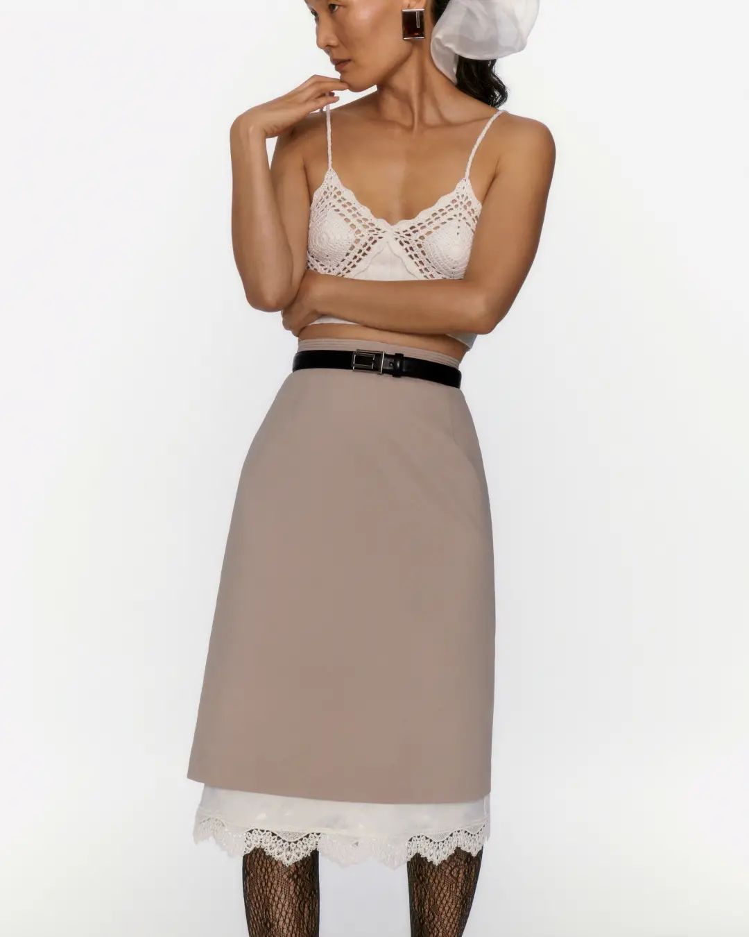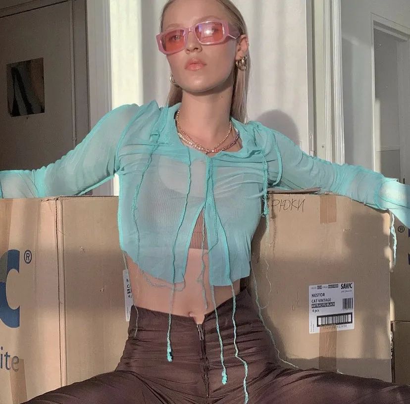 夏天不想露出太多皮肤的姐妹可以像模特Regina这样在针织背心外面搭一件薄纱紧身上衣