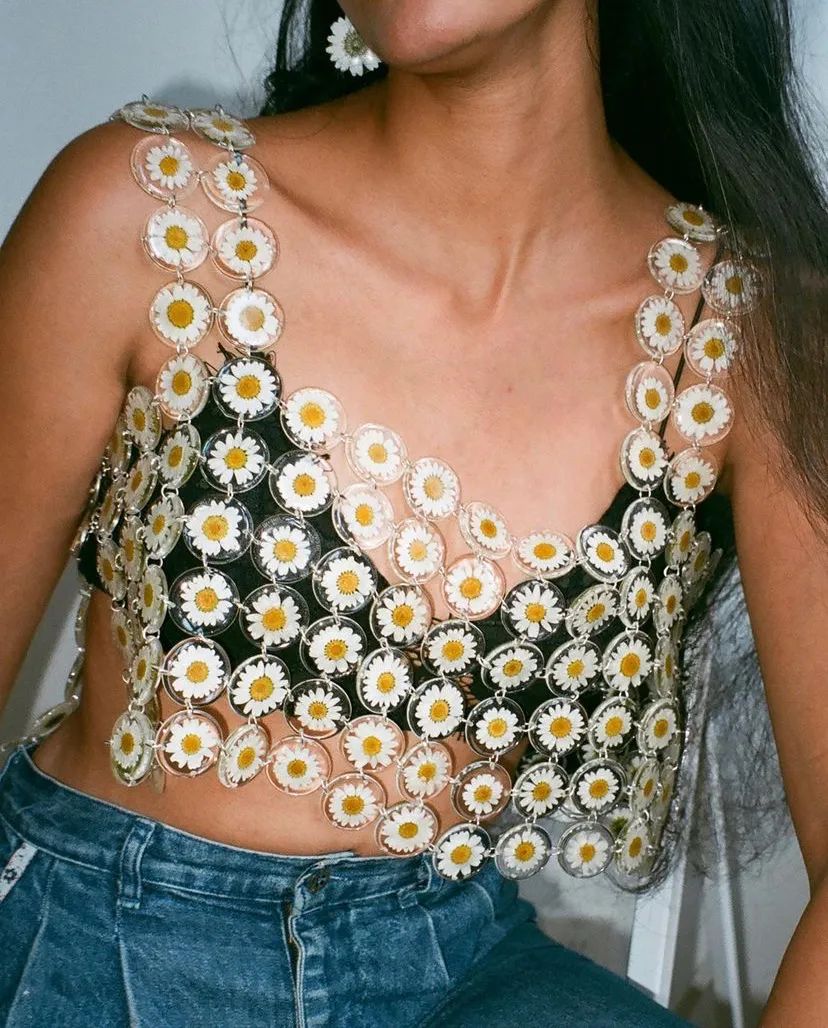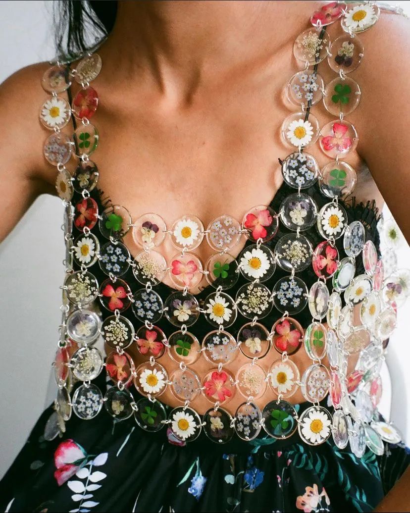 专注于可持续性发展的纽约时装品牌Dauphinette更是脑洞大开,居然用干花和亚克力片制作了超好看的背心,不愧是“地球上最快乐的品牌”。