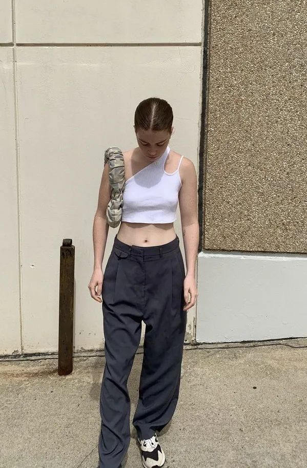 时尚博主Molly也穿过不规则的单肩背心,简单搭配阔腿裤就可以很有范儿。