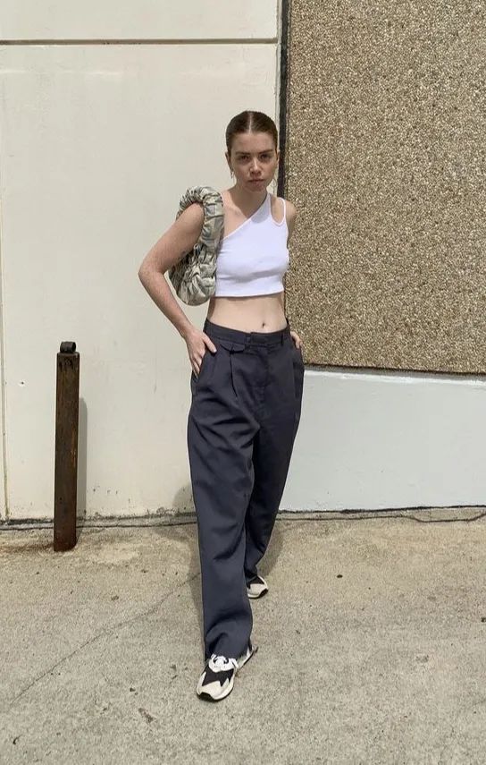 也可以像Hailey这样细吊带背心搭配超宽松的运动裤,上轻下重更显瘦,脚踩板鞋,你就是最Chic的Girl。