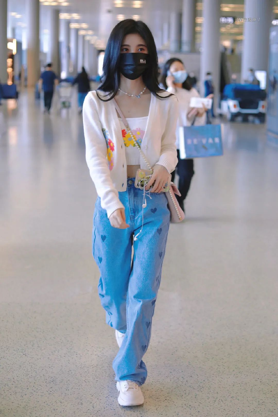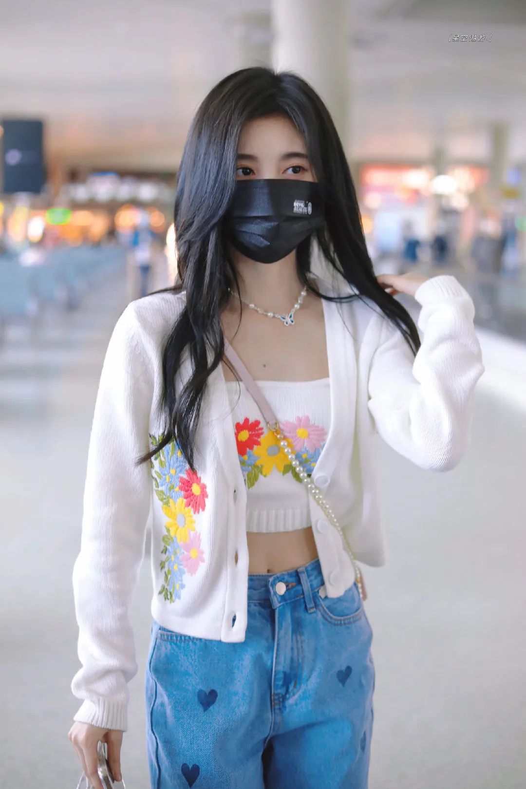 也可以参考鞠婧祎最近走机场的穿搭,抹胸短款