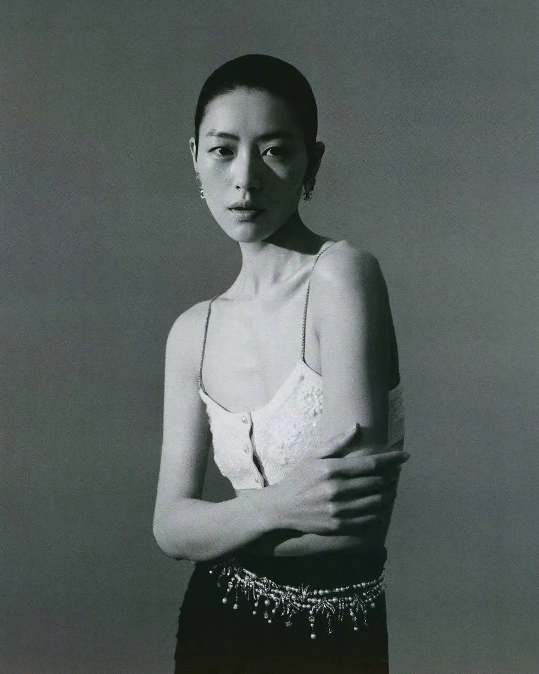 刘雯在登上五月的美版BAZAAR封面时穿的也是Chanel这款吊带背心,配上她具有东方美的脸庞更加别具风韵。