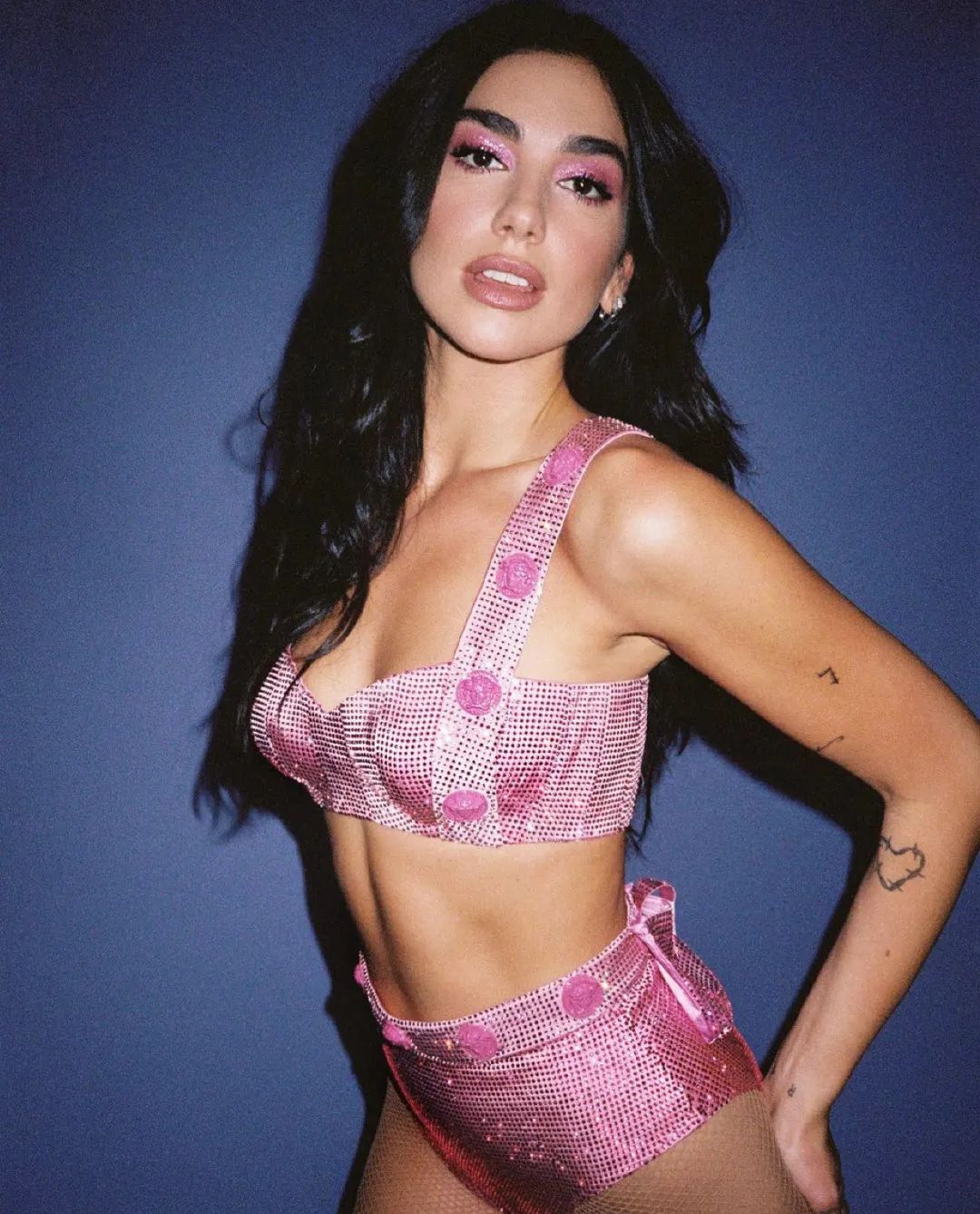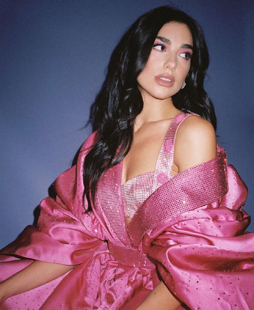 Dua Lipa在格莱美演出时穿的粉紫背心也很惊艳,礼服和内搭都是Atelier Versace的定制款,简直美炸了。
