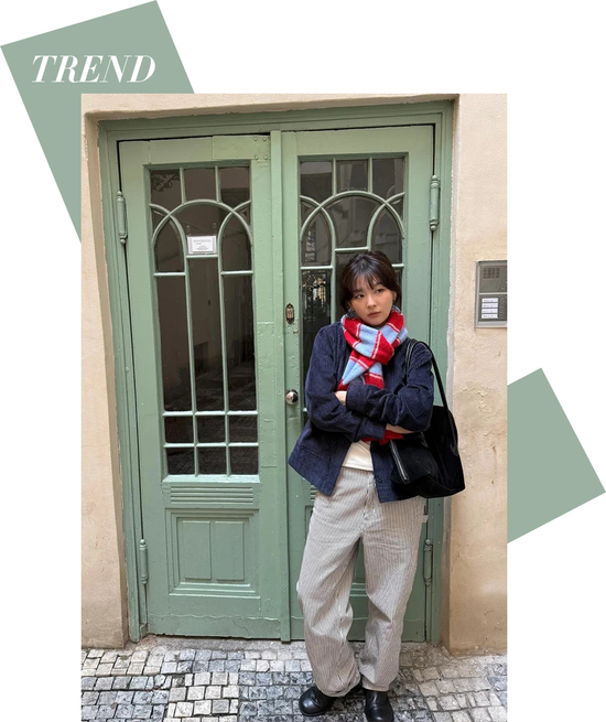巧妙地运用复古、明亮的色彩和带有校园、运动印记的元素,瞬间带来浓厚的书卷气息与复古感,也能让整体造型沉稳且富有层次。姜涩琪上身的深蓝色灯芯绒外套,其细腻的肌理与沉稳色调,瞬间奠定了文艺书卷气的基调。而整个造型的点睛之笔,莫过于那条红蓝配色的围巾,它不仅打破了深蓝的静谧,跳跃的色彩对比瞬间激活了全身。