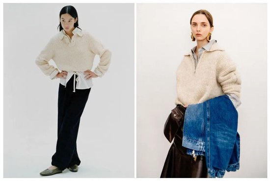 翻领Polo毛衣宽松的廓形和落肩的剪裁,避免了传统毛衣的紧束感,以一种松弛的姿态包裹身体,推荐选择米白色款式,温润的质感能进一步提升高级感,上身效果也简洁有力。