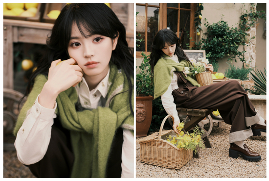 田曦薇的这身造型充满了学院气息,棕色的工装背带裤,搭配厚底乐福鞋,瞬间复古又俏皮,而披在肩上的绿色毛衣,独特的质感与色彩为整体注入了一丝静谧而美妙的文艺氛围。