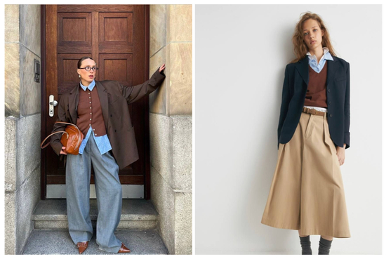 西装、针织衫与衬衫的经典三件套,堪称美式休闲感的精髓。可以尝试用浓郁的棕色针织衫作为过渡,内搭清爽干练的蓝色衬衫,通过色彩对比营造出视觉亮点,穿上身立刻显得精神饱满。