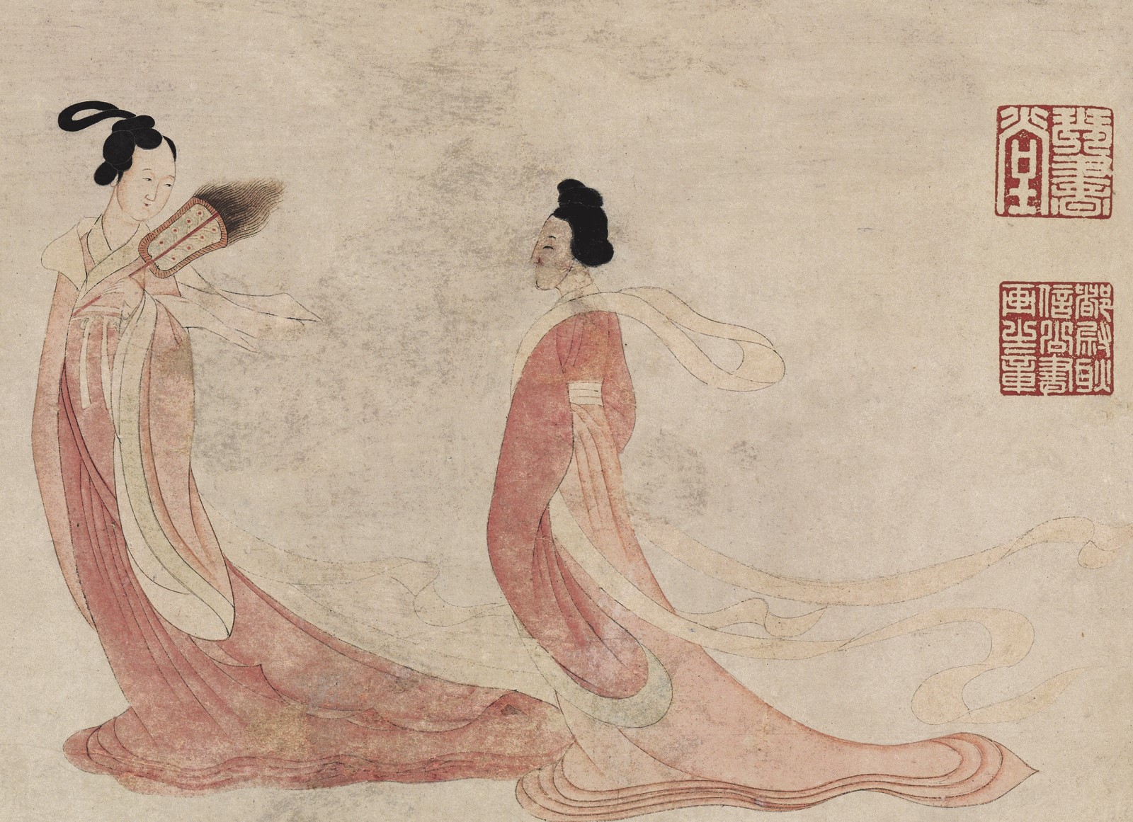 文徵明以山水、兰竹见图长,《湘君湘夫人图》是他寥寥无几的人物画品之一。画面上方有文徵明自题屈原《九歌》中的“湘君”“湘夫人”,画面中部右侧有万历六年七月文徵明次子文嘉的题跋。《湘君湘夫人图》作于文徵明48岁时,是打算送给他的朋友王宠(履吉)的。右下角明王樨登的题跋中指出,刚开始文徵明打算请画家仇英为这幅画设色,但仇英画了之后他又不满意,于是自己设色,从而达到了自己的理想效果。文徵明笔下的“湘君”“湘夫人”,处于画心的中央,飘逸脱俗。发髻高耸、手持纨扇的是“湘夫人”,她回头望着“湘君”,两人目光流露出的是依恋和不舍。作品设色淡雅,不画背景,题诗、题跋与画面内容紧密配合,充分体现了自“吴门画派”以来中国绘画诗、书、画结合的传统和具有文人趣味的审美要求。