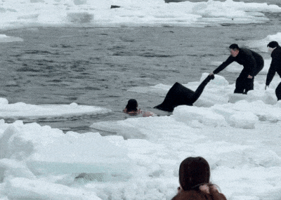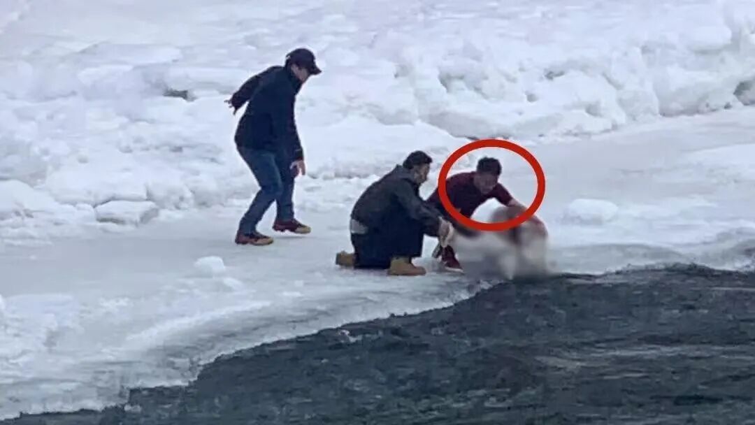 他一边安抚“别害怕”,一边牢牢抓住女孩的衣物,并呼召周围游客协助。在大家的合力帮助下,女孩被成功从冰水中拉出!
