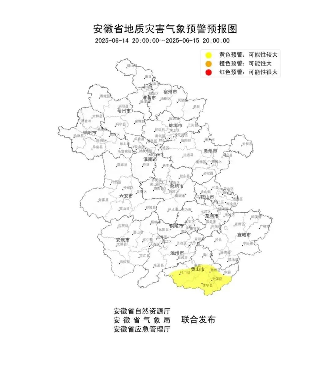 6月14日,安徽省自然资源厅、安徽省气象局、安徽省应急管理厅联合发布地质灾害黄色预警:6月14日20时至6月15日20时,黄山市全境发生地质灾害的可能性较大,请注意防范,并加强隐患巡查和排查,一旦发现隐患,提前避险转移。