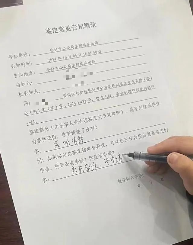 同时,张先生提供的一份嵩阳路派出所出具的《鉴定意见告知笔录》显示,经登封市公安局物证鉴定出具的【(登)公(刑)鉴(临)字(2024)432号】,张先生的孩子左上肢、骨盆的损伤程度为轻伤一级。