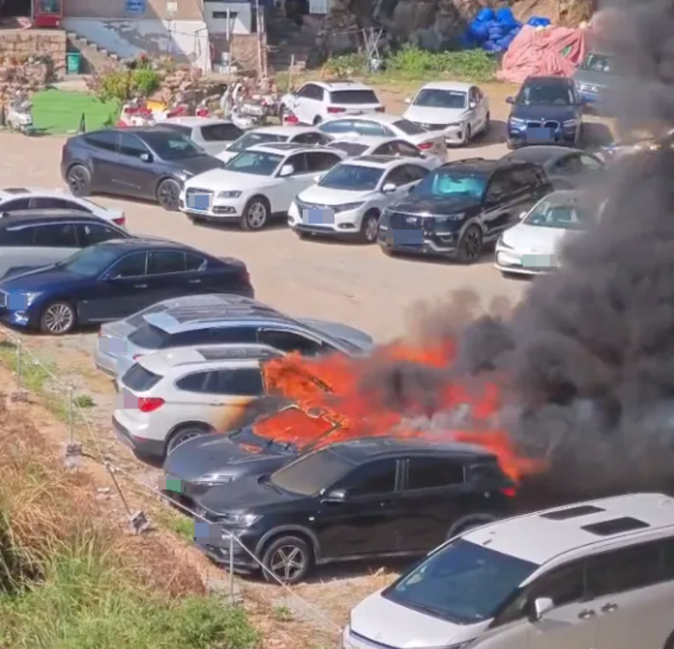 据网友拍摄的现场视频显示,一处空地上,一辆悬挂绿色号牌的新能源汽车首先起火。约半小时后,火势波及周边车辆,多辆车被烧至仅剩车架。事发后,当地消防及公安部门抵达现场开展救援。