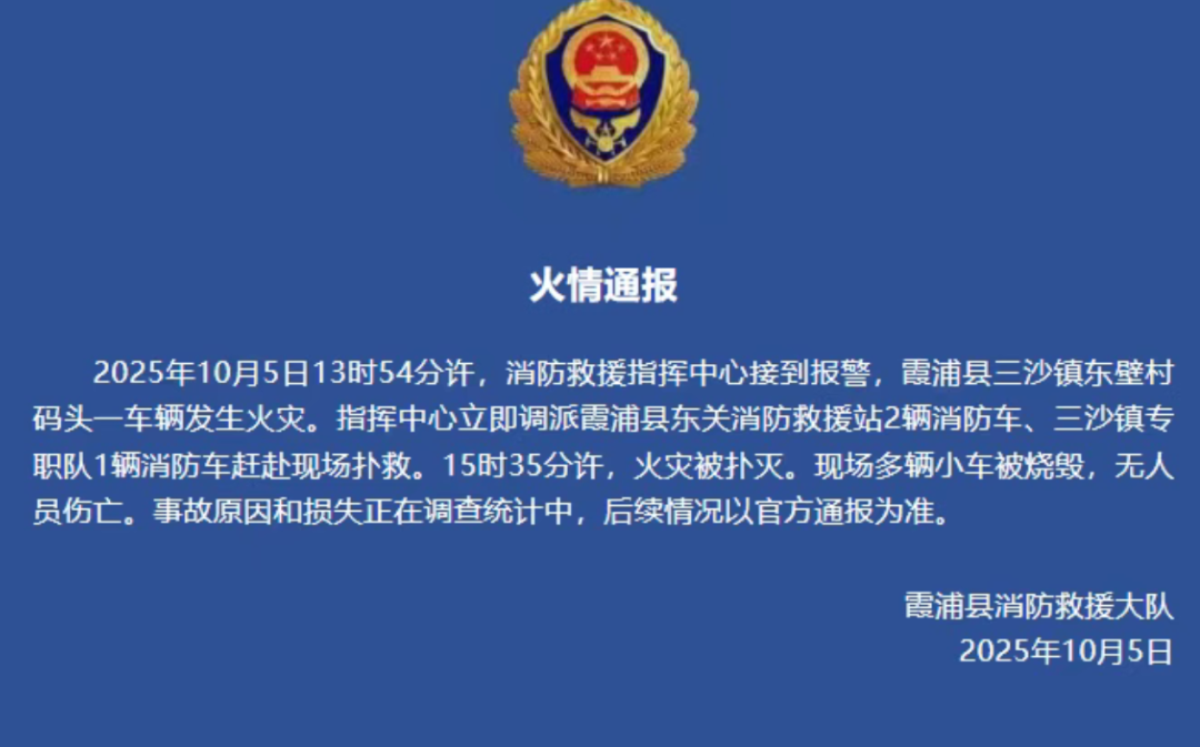 10月5日晚,福建省宁德市霞浦县消防救援大队发布火情通报称,当日13时54分许,消防救援指挥中心接到报警,霞浦县三沙镇东壁村码头一车辆发生火灾。