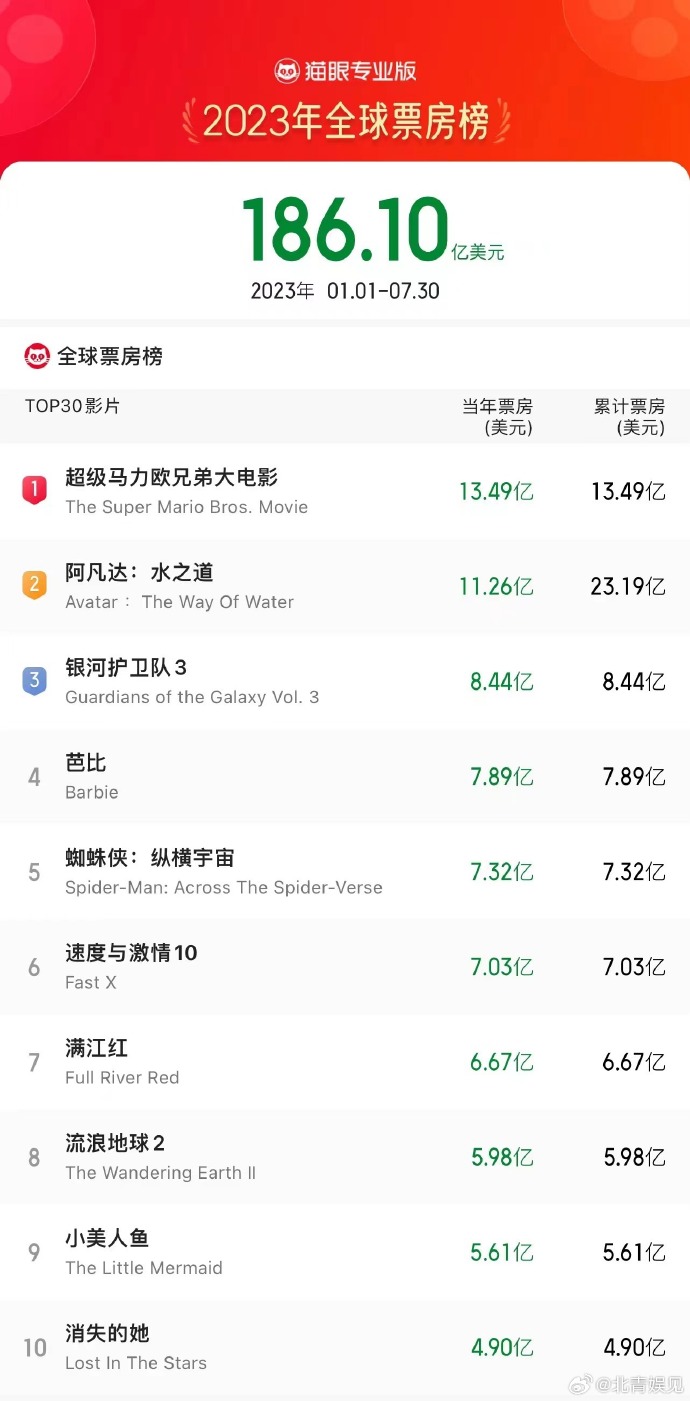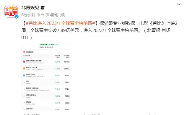 据猫眼专业版数据,电影《芭比》上映2周,全球票房突破7.89亿美元,进入2023年全球票房榜前四。