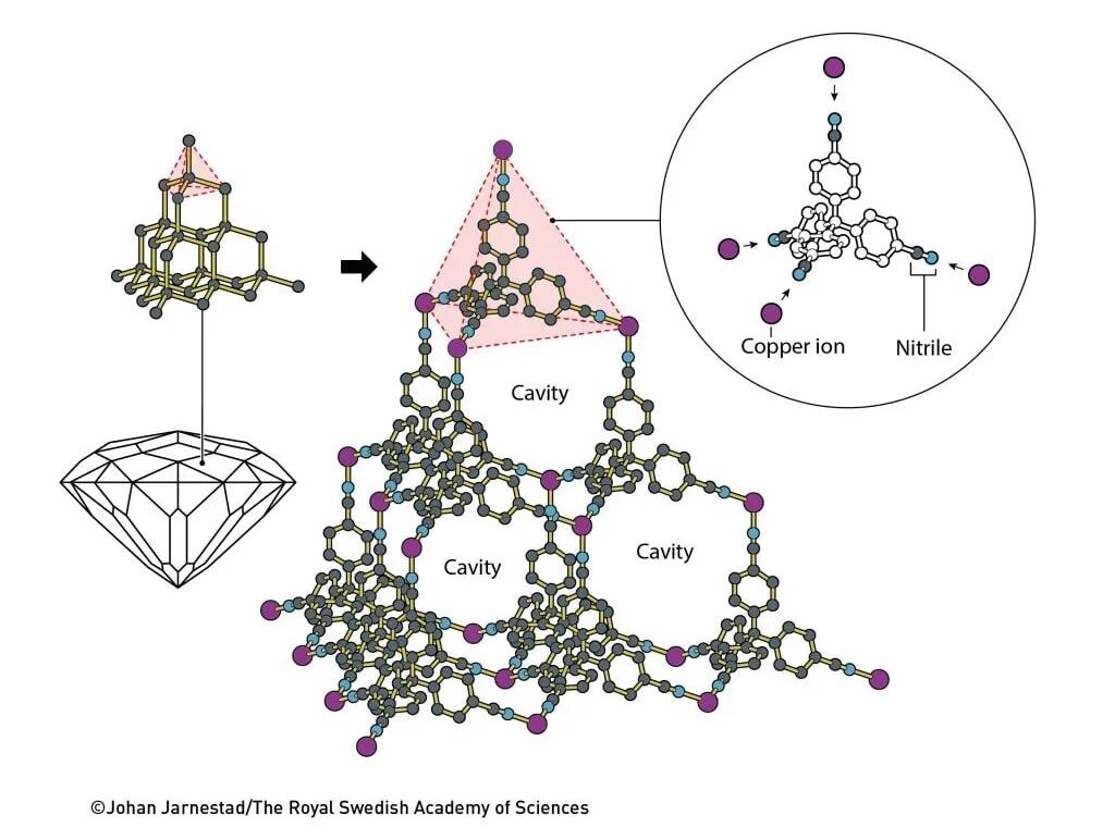 直到十多年后,他终于动手验证这一想法。罗布森将带正电的铜离子与四臂分子相结合,结果这些分子像钻石晶格一样自组装成规则的三维晶体结构,不同的是,这种晶体内部竟有大量空腔。1989年,他在《美国化学会志》上发表成果,首次提出这类分子网络的潜力,预言它们将赋予材料前所未有的性质。
